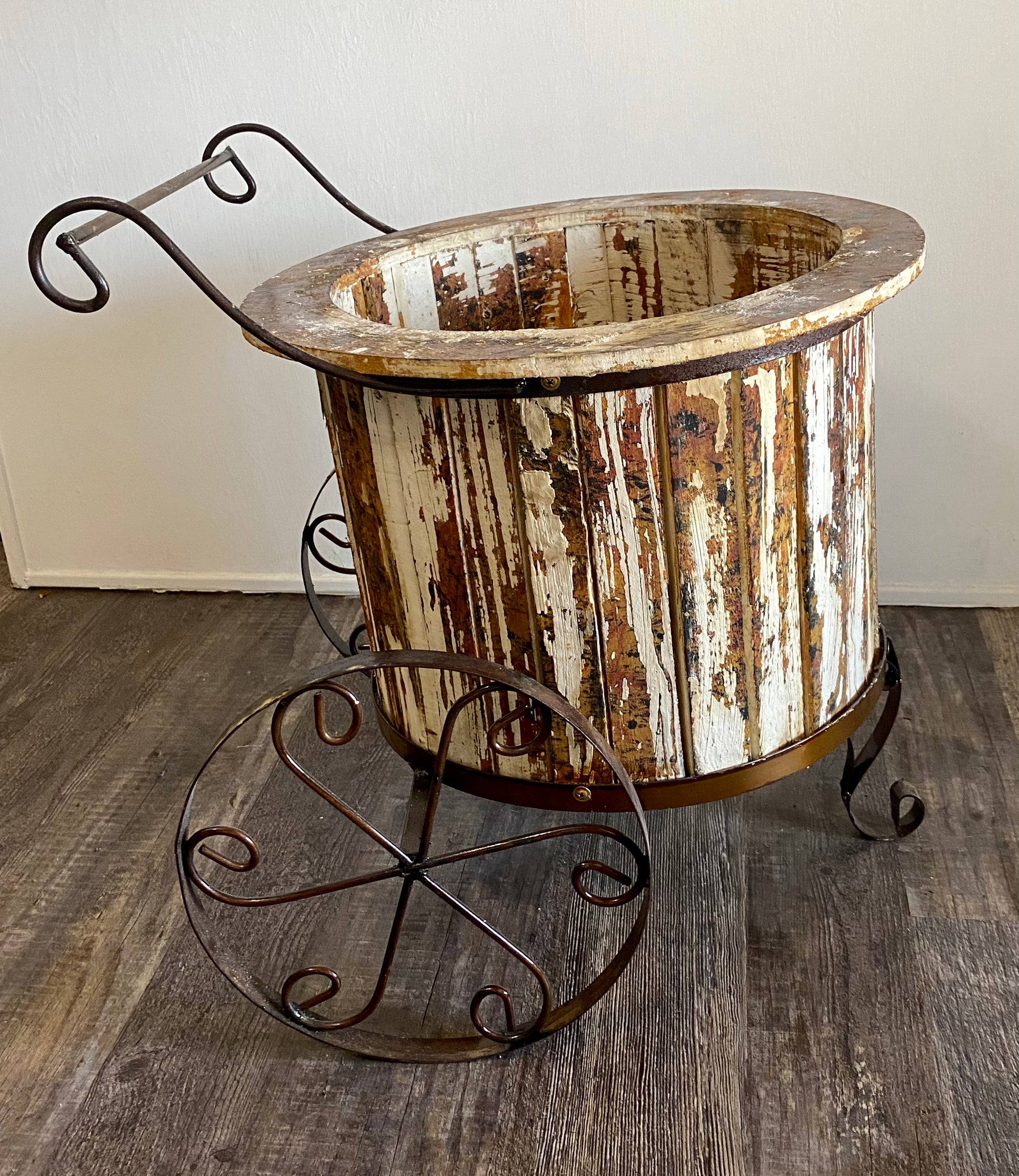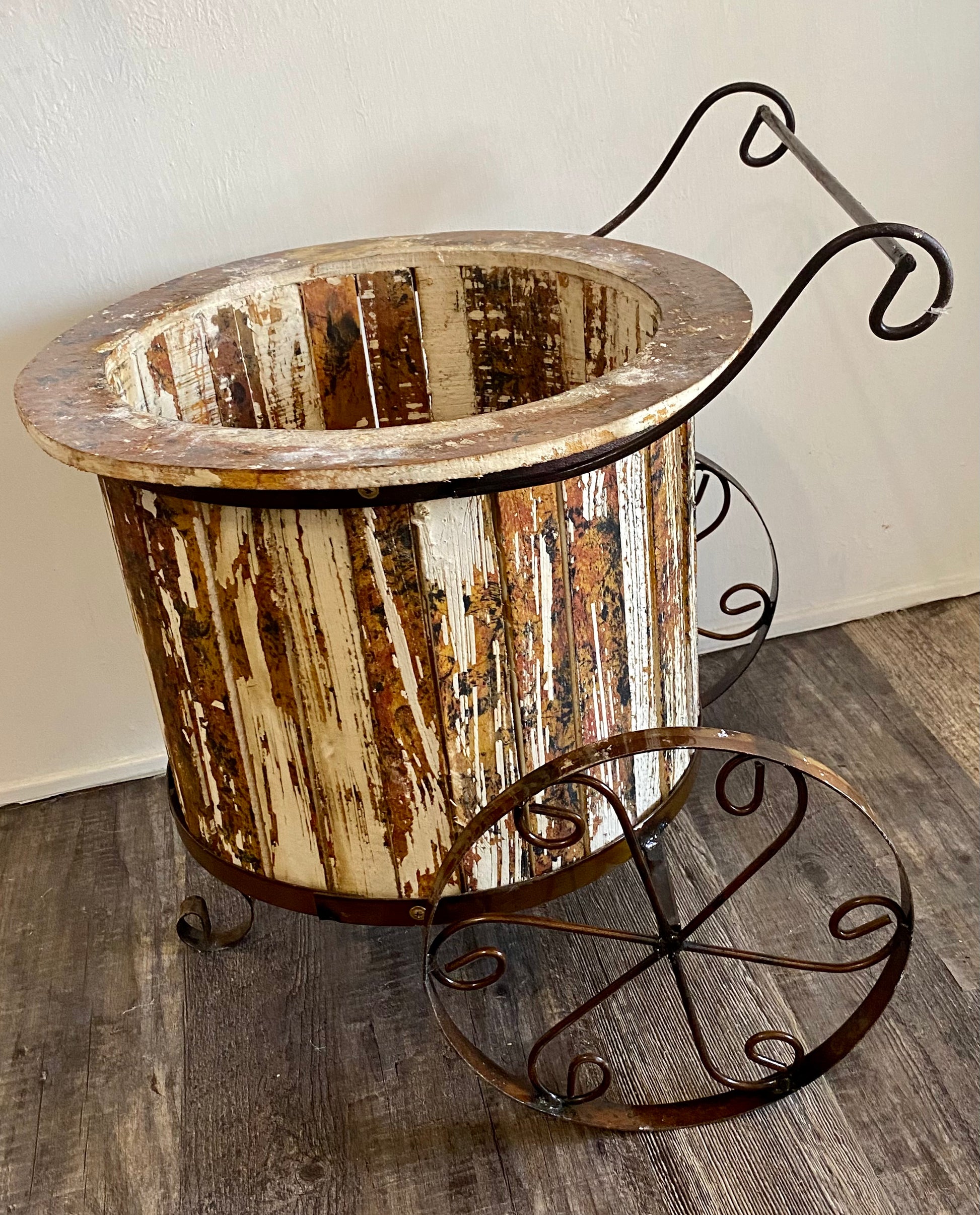 Small wood and metal wheelbarrow planter